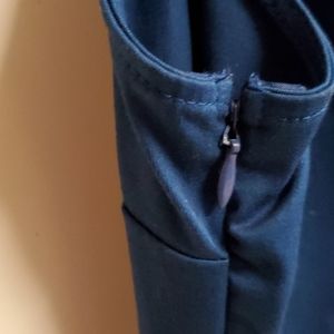 Has invisible side seam zipper and standing collar and at center front bodice