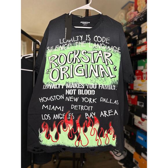 Elevate your wardrobe with this brand new Rockstar Original shirt! Featuring a bold black flames design, this shirt is sure to turn heads.