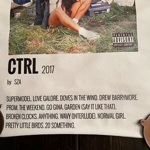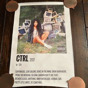 This offering is a new poster of SZA CTRL 2017. It has the album cover with the playlist. The print is on canvas. The item is 12 1/2” x 18. This poster will be great for framing if desired. The item is new.