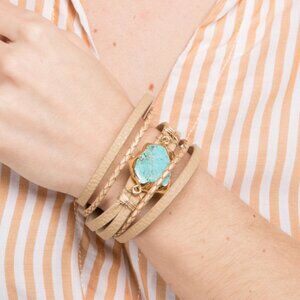 Our beautiful Braided Turquoise Bracelet is where boho meets chic. The soft leather straps with a wonderful turquoise stone centerpiece fit comfortably around your wrist. Once you slip this on, you'll radiate mystical beauty.