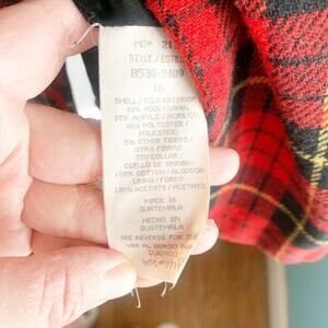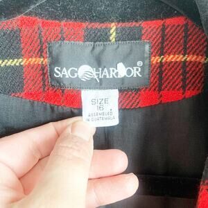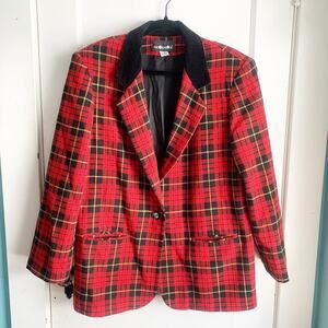 Saag Harbor Vintage Schoolboy Wool Blend Plaid Blazer Velvet Collar Size 16. Red plaid print with black and yellow accents. Black, velvet collar. Front slit pockets function. Single button closure. Shoulder pads. Lined. 1980s 1990s vintage retro style. Good, preowned, vintage condition. Please see measurements as vintage sizing may differ from modern sizing.