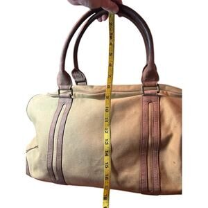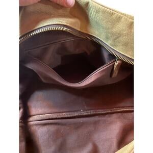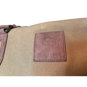 Saari Duffle Bag Madras Weekend Luggage Gym Military Green Brown Canvas Leather in EUC. Heavy duty canvas makes this a dependable and stylish choice for traveling. Zippered inside pockets to keep personal items safe. This is an amazing bag! See pics for condition confirmation and measurements.