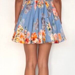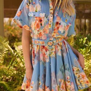 The Saba Mini Dress is made from a luxurious linen cotton blend and features a stunning blue floral print. The kimono sleeves and shirt collar exude effortless sophistication, while the front button closure and buckled belt add a touch of refinement. Perfect for warm days and chic evenings.