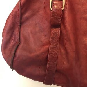 Rich buttery leather in a beautiful deep red. Large duffle style bag. Comes with 2 short straps and a removeable shoulder strap. I had salad dressing spill in this (the interior is clean) but I have a close up of the slight discoloration on the outside. It's not super noticeable. Beautiful bag!