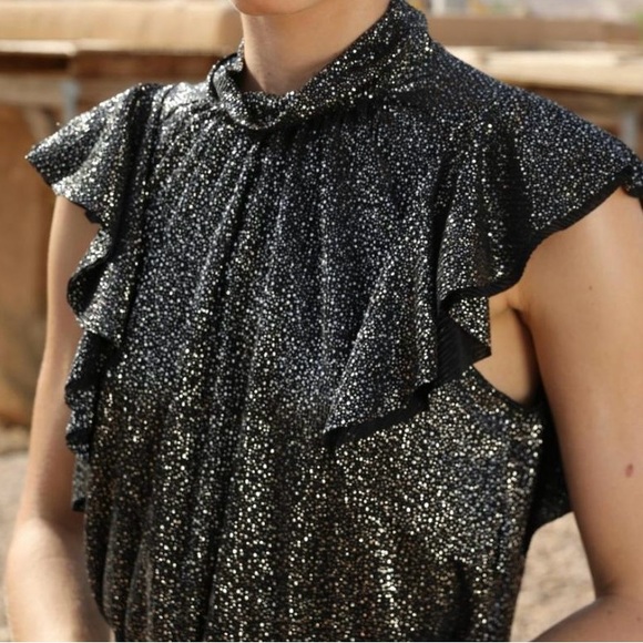 Black sleeveless black high neck sparkle, shimmery gold top with ruffle arms, keyhole back