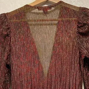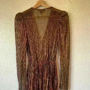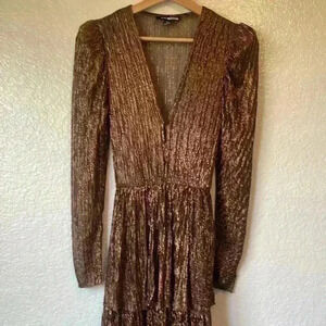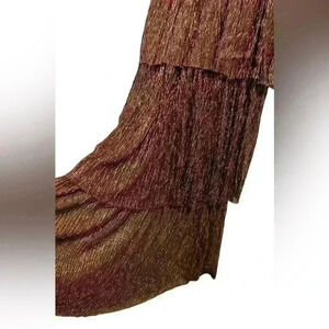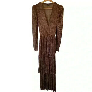 Elegant brown midi dress. Features long sleeves and tiered skirt. Perfect for any occasion.