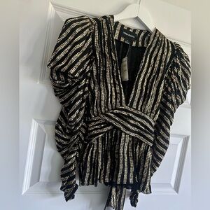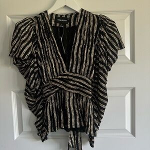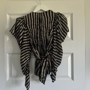 Pleated knit v neck top with waist detail, back tie and draped sleeves.