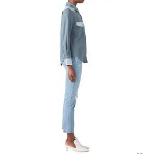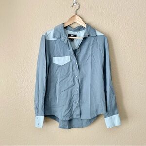 Grey blue tencel (100% Viscose). Shirt collar neckline. Exposed front snap closure. Front pocket. Long sleeves.