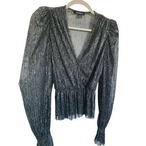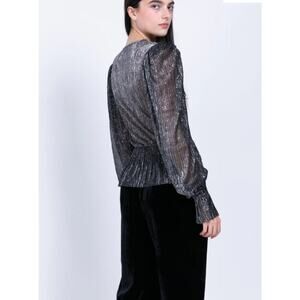 Pleated knit with sequins peplum top with V-neck and puffy long sleeves with cinched cuffs, and gathering at the waist.