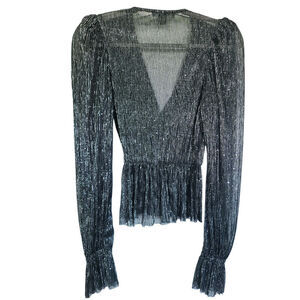 Pleated knit with sequins peplum top with V-neck and puffy long sleeves with cinched cuffs, and gathering at the waist.