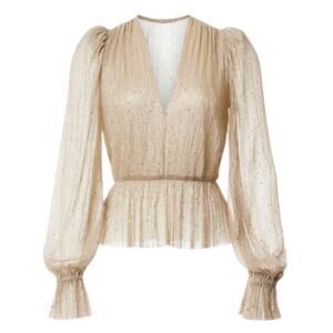 Take your festive girl's night look to the next level with this sheer metallic top by Sabina Musayev. Style the plunging neckline with with a delicate drop necklace to complete the sparkling outfit.
