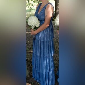Stunning blue gown with metallic accents that catch the light beautifully. Features a flattering deep V-neckline, twist-front detail, and a flowy tiered skirt that adds elegance and movement. Perfect for weddings, formal events, or any occasion where you want to stand out.