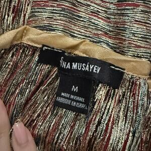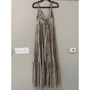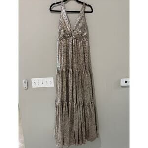 Sabina Musayev Pacific Dress in Gold. Women's Size M / Medium. Features golden foil fabric with multi color detail, adjustable shoulder straps, plunge v neck, twist detail at front waist, open back, hidden back zipper closure and attached tie closure at back, tiered skirt, partially lined, long maxi length. 50% poly, 50% metallic. Minor loose metallic threads throughout (normal for dress). Retail $565.