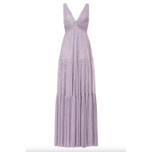 Purple metallic chiffon (100% Polyester). A-line. Sleeveless. V-neck. Back zipper closure. See size and fit notes for length measurements. Imported.