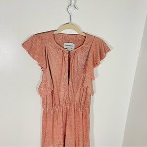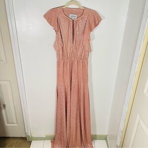 Description: Flecked with lurex in blush plissé crepe, the label's Topaz gown is a event-ready stunner with delicate flutter sleeves. Keyhole neckline hook closure. Elasticized waist.