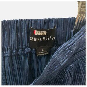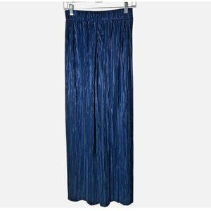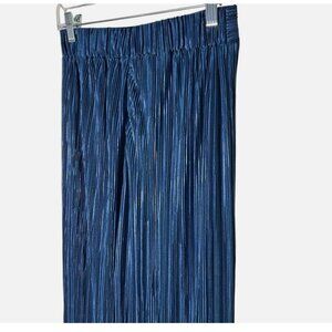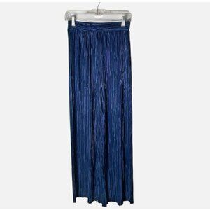 Sabina Musayev - Women's "York" pant, wide-leg, full length, lightweight, with zip-back closure, elastic waist, textured shimmer fabric, and side slits at hems, in a deep blue. Original retail $230.