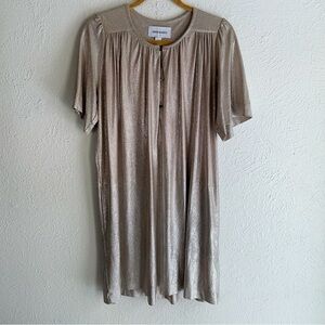 Gorgeous Sabina Musayev for Anthropologie metallic mini dress in a dreamy silver champagne tone. Features a button-front neckline, short flutter sleeves, and a soft, draped silhouette that catches the light beautifully.