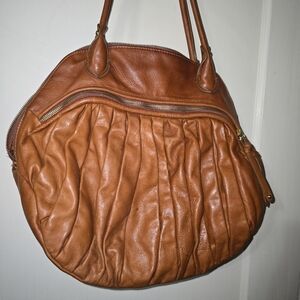 Sabina New York Brown Leather Hobo Handbag Pleated Rounded Zippers 18x13"
