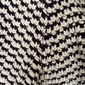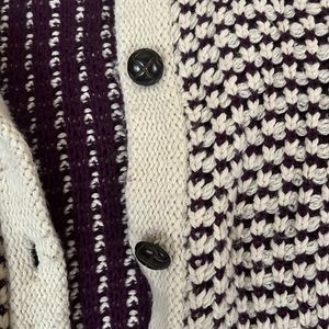 Sabine Medium Long Knit Cardigan, 80% cotton, 16% Nylon, 4% other fiber. Off white and purple, cute brown buttons. It’s used — been worn a few times — but still in pretty good condition!