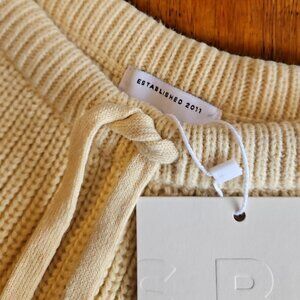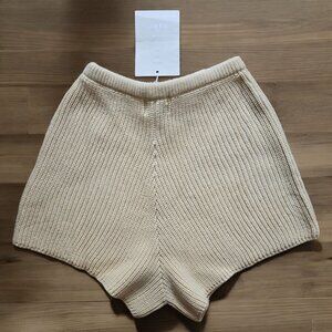 These cozy cream knit shorts from Sabo Skirt are perfect for lounging in style. Made from soft acrylic, they feature a comfortable elastic waistband with a drawstring for an adjustable fit.