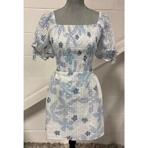 • Square neck. Smocked. Strappy open back. Floral print. Mini length. Short puff sleeves. Eyelet embroidery.