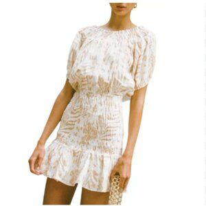 Sabo Luxe Camari Linen Smocked Mini Dress Animal Print Neutral Puff Sleeve