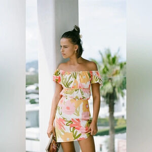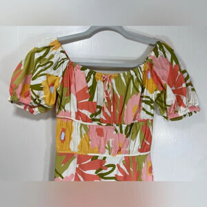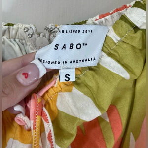 Sabo Rory Mini Dress 100% Cotton Floral Print Retro 60’s Inspired Women’s Size Small. Outer and lining is 100% Cotton. Designed in Australia. Made in China. Hand wash. Fully lined, off the shoulder style featuring a tie at centre neckline, short puff sleeves and bind detailing across waist. Has a zipper closure on the back.