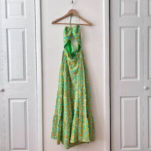 Stand out in the Calais Dress, made from a structured cotton seersucker fabric with our exclusive chalk floral print. It features a halter neck tie, cutout and strap detail at waist and a flouncy tiered ankle grazing skirt.
