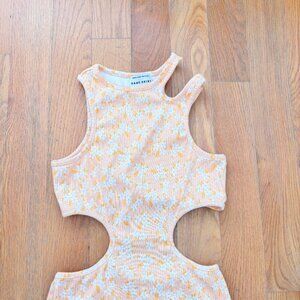 Dress it up with heels or keep it casual with fresh sneakers! The Esber Dress is made from a natural ribbed cotton fabric in orange with our exclusive floral print throughout. It is a fitted style featuring a cutout at shoulder, rounded neck and cutout at waist.