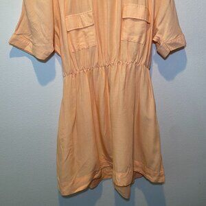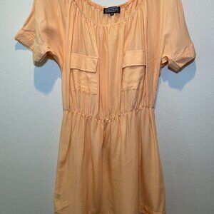 Light Orange off the shoulder dress with elastic at the waist. Two pockets on the front