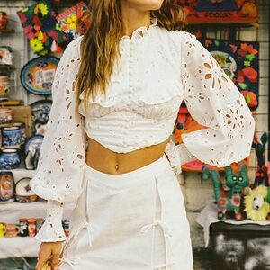 Elevate your look with the SABO LUXE Sylvie Top, made from a high quality natural cotton voile broiderie fabric in white. It features a high neckline with frill detail, unlined full length puff sleeves with shirred cuffs, gathered cups with frill detail, covered buttons down centre front and a curved hem. Style with a little white skirt! Designed exclusively by Sabo.