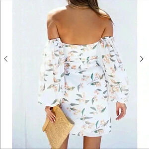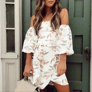 white fabric with sabo skirts exclusive hand painted wattle print throughout. It is an off shoulder style and features full length puffy sleeves, wrap skirt, asymmetric hem and boning at bust for added structural support.