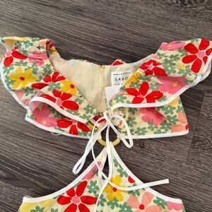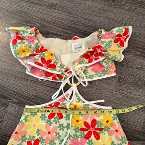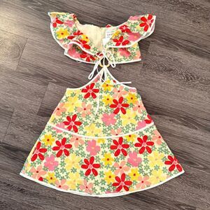 The perfect piece for your vacation wardrobe! The Delaware Cutout Dress is made from a structured natural linen cotton blend fabric with our exclusive pina floral print. It features contrast bind trim and panel details, halter neck tie, ring at centre bust, frill across neckline and arms, cutouts at waist and a little a line mini skirt