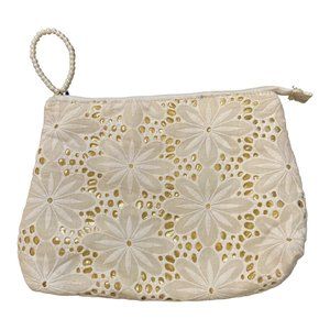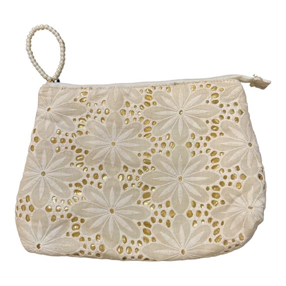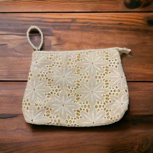 Crafted with a delicate floral pattern and eyelet detailing, this pouch combines style with practicality, making it perfect for both everyday use and travel.