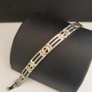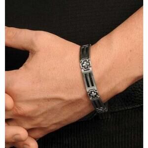 This Sabona bracelet has a polished stainless steel cross is framed in black and accented by brushed stainless steel and black steel cable with a magnet in each connector link. 7 1/2 inches around inside. Has minor signs of wear and comes in original box.