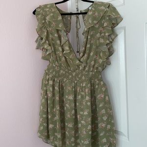 never worn dress. size large w/ tags still attached. green floral dress. super cute summer dress. can be dressed up or down. never wore it & in amazing condition. backless dress and ruffle detail