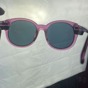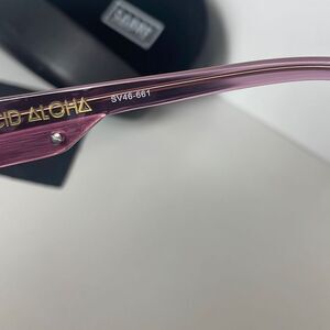 Sabre Acid Aloha Purple Plastic Frame Sunglasses SV46-661. Features plum purple plastic frames with gold wrapped accent on the arms, oversized full coverage black/dark charcoal lenses. Comes with black hard shell case and cleaning cloth. Gently worn with some very light lens scratches. If you love oversized glasses, grab this fabulous pair!