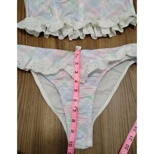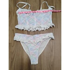 The Sabrina by Mervene 90's Corset and Underwear Set in multicolor gingham is a vintage-inspired piece perfect for women looking to add a touch of retro style to their wardrobe. Made from a blend of polyester, spandex, and nylon, this corset features a pullover closure, adjustable straps, and ruffle accents for added flair. The set includes a size L corset top and medium underwear, making it a versatile and unique addition to any collection. Perfect for those who love the 90s aesthetic and want to make a statement with their fashion choices.