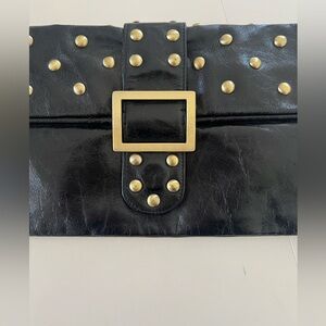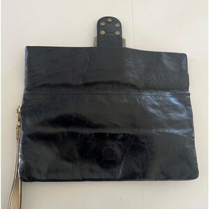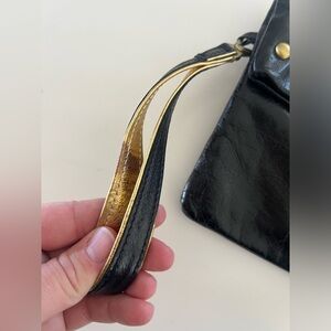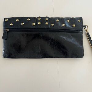 Sabrina New York Black Patent Leather Brass Studded Fold Over Wristlet