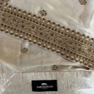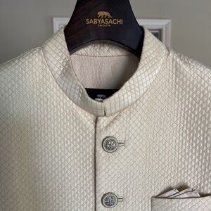 Bone Ivory Micro Quilted Silk Sherwani + Tussar Georgette Shawl With Binal Buti