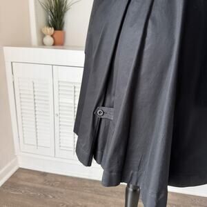 - gray stretch knit fabrication, black twill flared pleated A-line skirt at back, crew neck, long sleeves