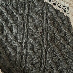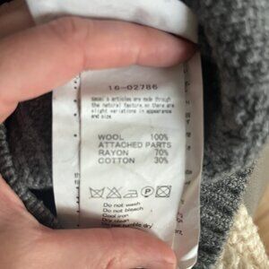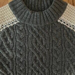 Chunky cable knit, 100% wool. Playful white rayon and cotton applications -you can see a bot. See below for measurements.