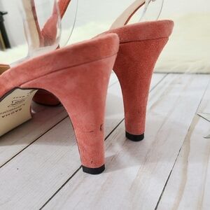 Sacha London pink suede peep toe heels. These pumps feature a gorgeous bubblegum pink suede upper and slingback ankle strap. 3" heel. Handmade. Size 9.5.