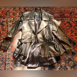 This incredible jacket is SO CHIC & fashionable! The high-low styling elevates this leather Moto jacket to another level! It is soft as butter, fitted through the shoulders and chest and looks great zipped up or open. It is in perfect condition, worn maybe just 3 times and kept in a bag in my closet. Now it no longer fits so it needs a new home. My loss is your gain- this is a real stunner. EU sz 44 = approx sz 10 US. Shop with confidence!🌹