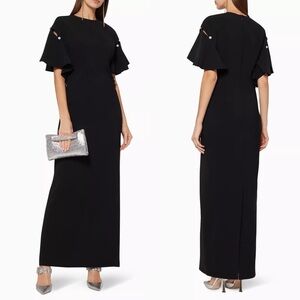 Stretch crepe column gown with drop ruffled sleeves and crystal button detail.