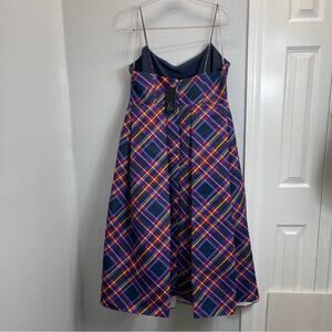 Sachin & Babi's charming Audra midi-dress showcases a bright plaid design, fitted with a scoopneck and fixed shoulder straps. Silhouetted with fit-and-flare style, this design evokes retro inspirations.