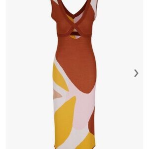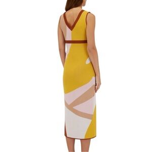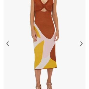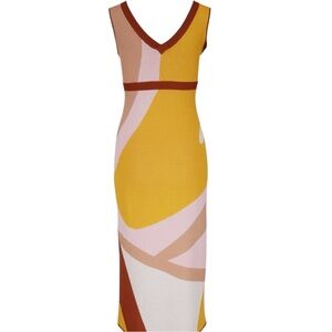 This elegant bodycon midi dress by Sachin + Babi features a sophisticated color-block design in brown and white. The sleeveless dress boasts a flattering V-neckline and a form-fitting silhouette, perfect for a cocktail night out. Its contemporary style is enhanced by the artistic flow of colors, making it a standout piece for any occasion.