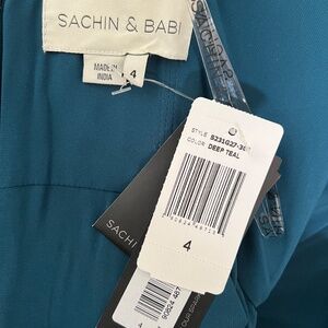 The dress is the "Ceri" strapless ball gown in "Deep Teal" polyester/silk blend lustrous satin. It has a foldover neckline with beaded embellishments and a removable adjustable belt. It has a full box pleated skirt with pockets and a front slit. It has boning at the bodice and a back zipper closure. It is fully lined. Retail $995.