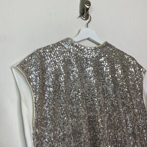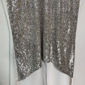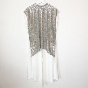 Gorgeous blouse by Sachin and Babi new with tags. Ivory blouse with cap sleeves. Mock neck design with a silver sequin front bodice and collar. Long in the back with "tails." Closes with a double button tab on the interior at back of neck with decorative fabric covered non functioning buttons on the exterior. Lined. SO PRETTY and a perfect alternative to a cocktail dress! All measurements are approximate, taken flat and closed.
