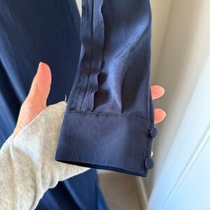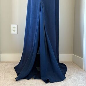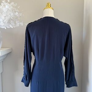 Make a breathtaking entrance in this exquisite navy blue evening gown by Sachin and Babi, a perfect blend of elegance and modern sophistication. Flowing gracefully to the floor, this full-length design features long sleeves for a refined touch, while a modest side slit adds just the right amount of movement and allure. A delicate silk sheer panel on the opposite side introduces a luxurious contrast, enhancing the gown’s ethereal beauty. The sophisticated keyhole detail at the front of the bust adds an understated yet alluring charm, while raw-edged trim on the shoulders lends a couture-inspired finish. Luxe covered buttons at the neck and cuffs add a polished, vintage-inspired touch. Perfect for formal galas, black-tie events, or any occasion where timeless sophistication is a must, this gown ensures you’ll captivate with effortless grace.